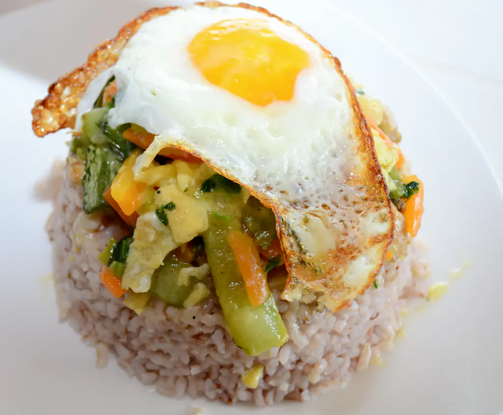 - Déposez l’œuf au plat sur le sommet du dôme de riz.